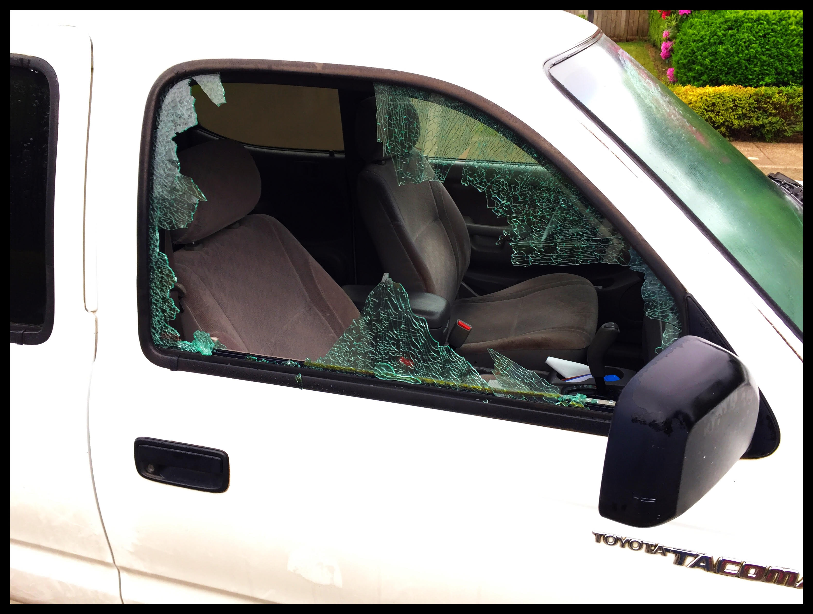 Fast-forward to this morning when I go out to get the morning paper and discover her passenger side window smashed in and her purse missing.