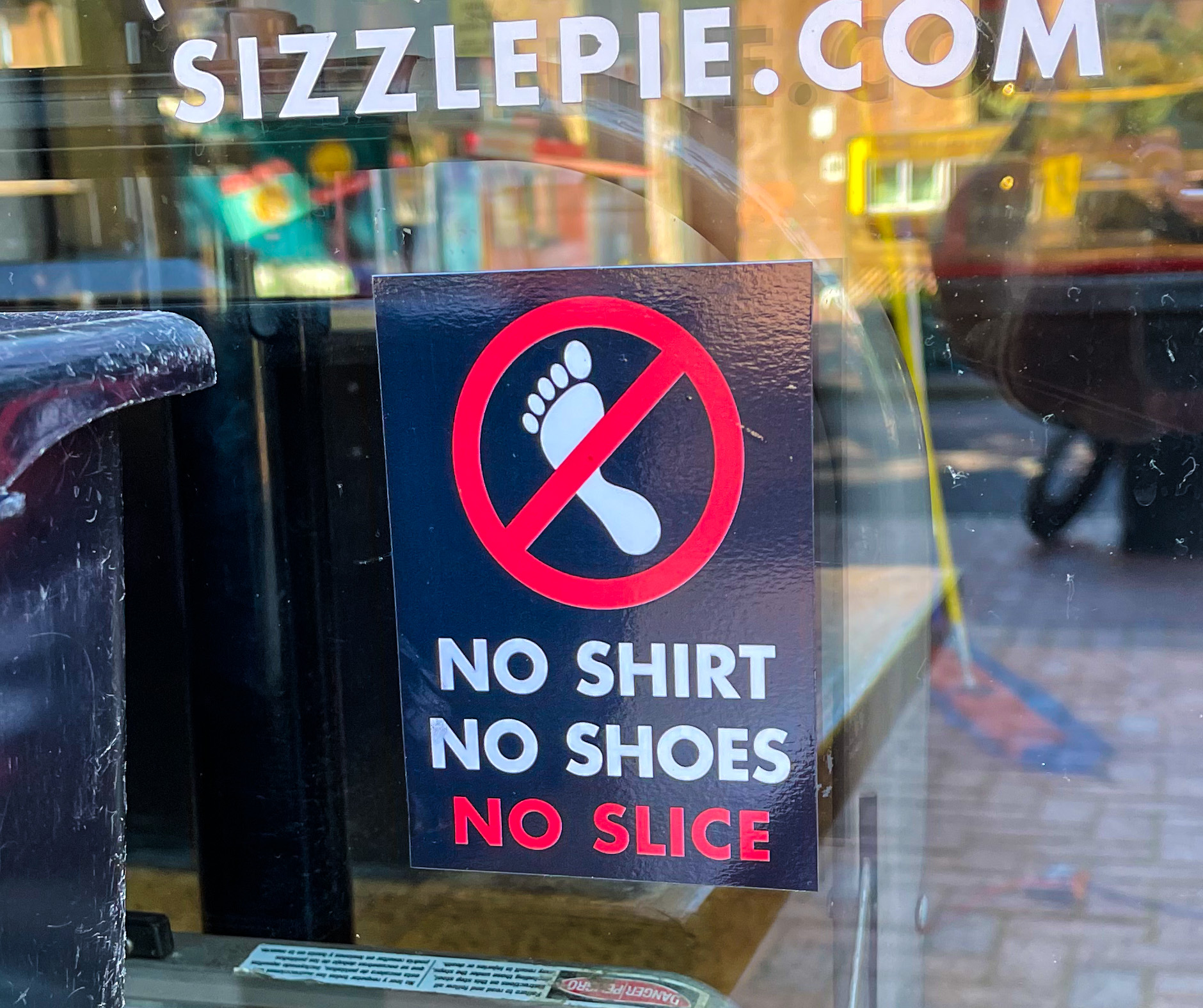 I’ve been in Sizzle Pie. I’ve seen their customer base. Heck, I AM their customer base. Trust me on this Mr. Sizzle Pie manager, people without shirts are the least of your problems.